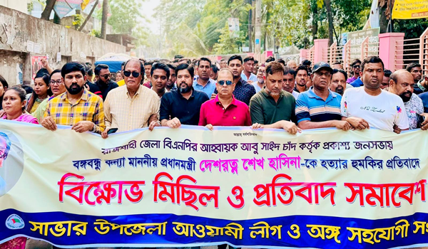 ফাহাদ-ই-আজম:- প্রধানমন্ত্রী শেখ হাসিনাকে প্রাণনাশের হুমকির প্রতিবাদে সাভারে বিক্ষোভ মিছিল করেছেন উপজেলা আওয়ামী লীগ।