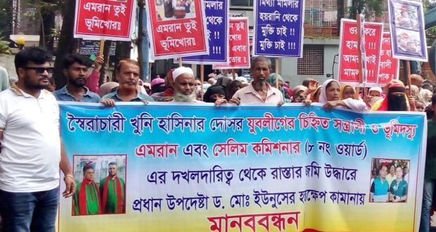 শাহজাহান মিয়া, মনা মিয়া, উম্মে স্নেহাসহ শতাধিক ভুক্তভোগী পরিবারের সদস্যরা এসময় ভূমিদস্যুদের বিচার সম্বলিত বিভিন্ন প্ল্যাকার্ড ও ফেস্টুন হাতে মানববন্ধনে অংশ নেন।