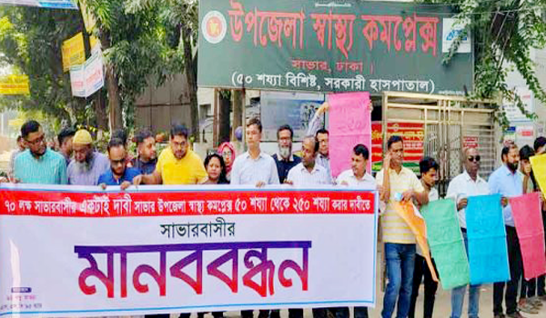 সাভার উপজেলা স্বাস্থ্য কমপ্লেক্সকে ২৫০ শয্যায় উন্নীত করার দাবিতে মানববন্ধন